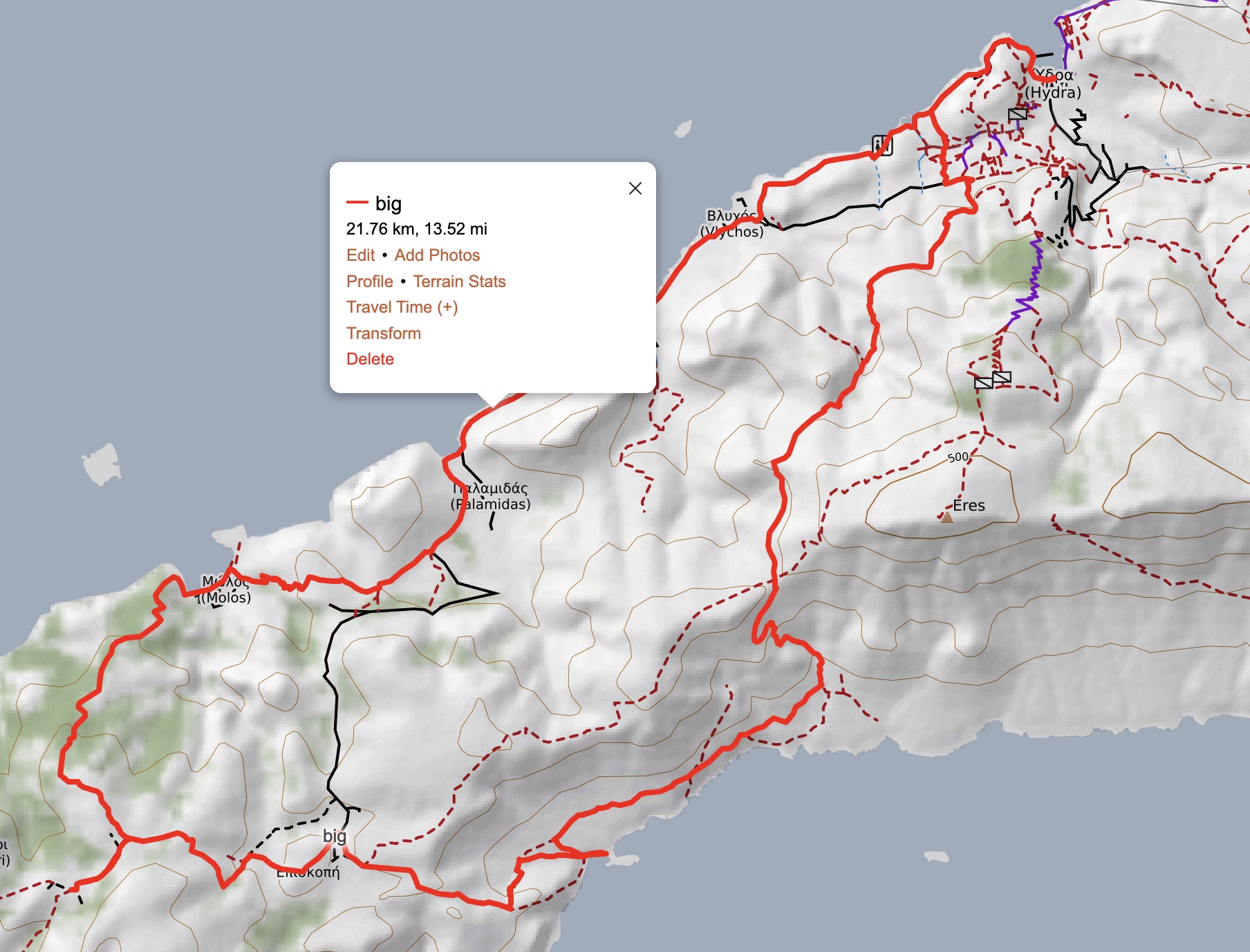 Using a tool like CalTopo, I trace out the route that I explored. In the case of a day hiking, I usually know exactly what trails I took, and they often exist in OpenStreetMap data.