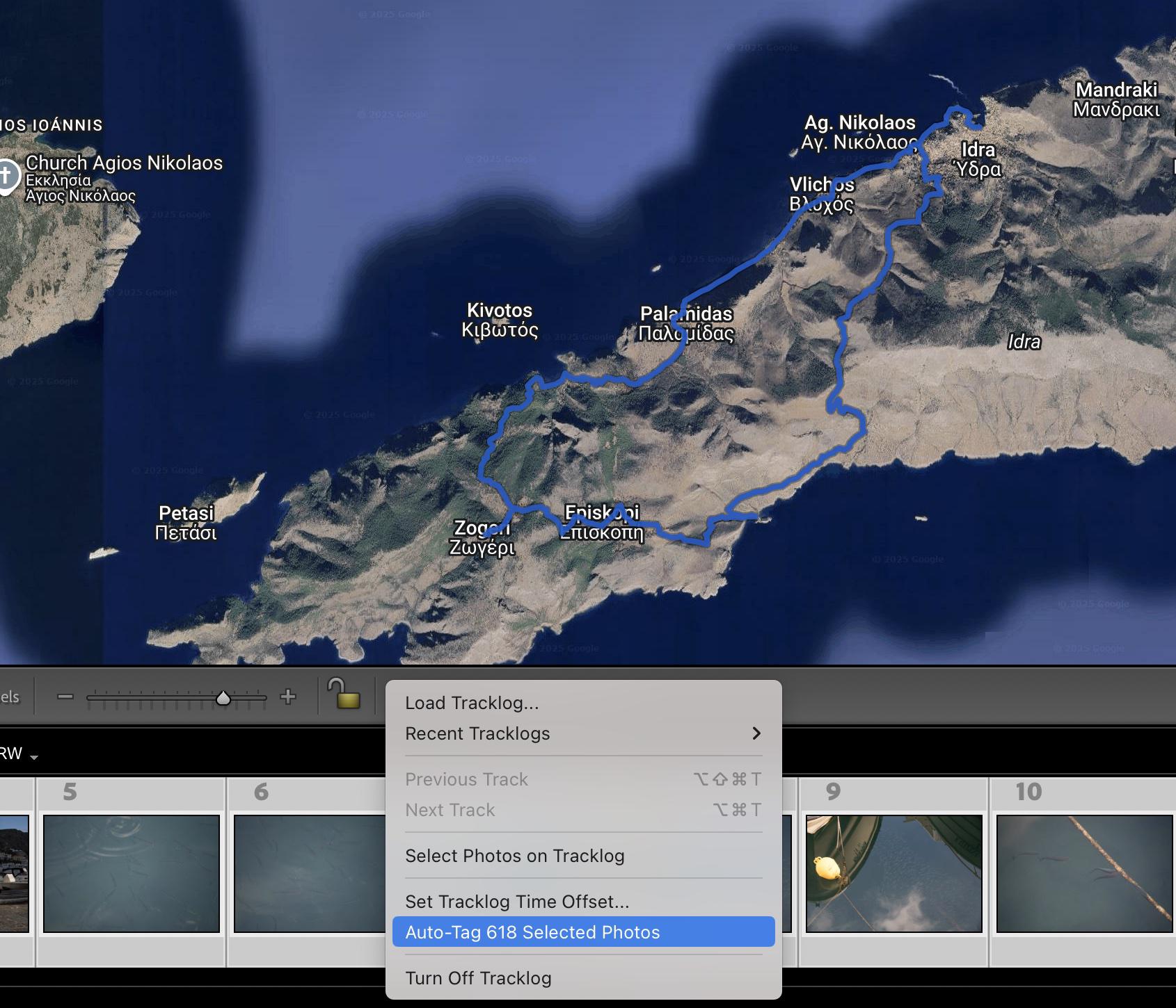 Download the GPX trace from Linetime, then import into Lightroom and geotag the photos.