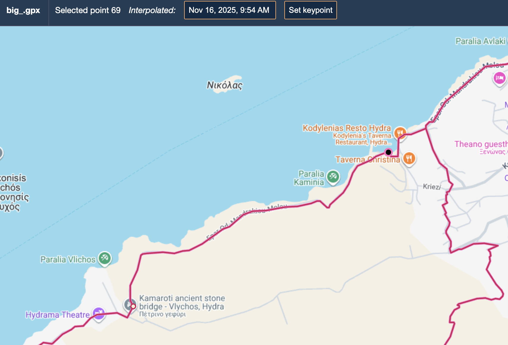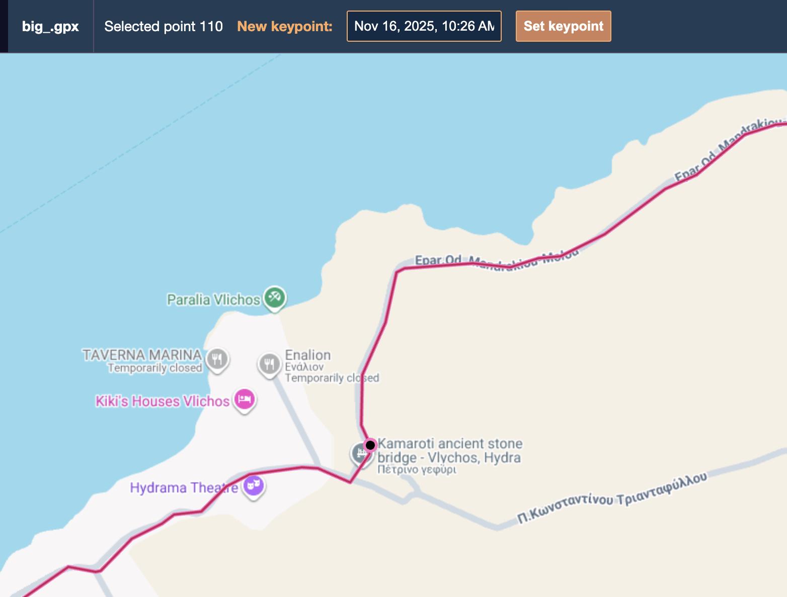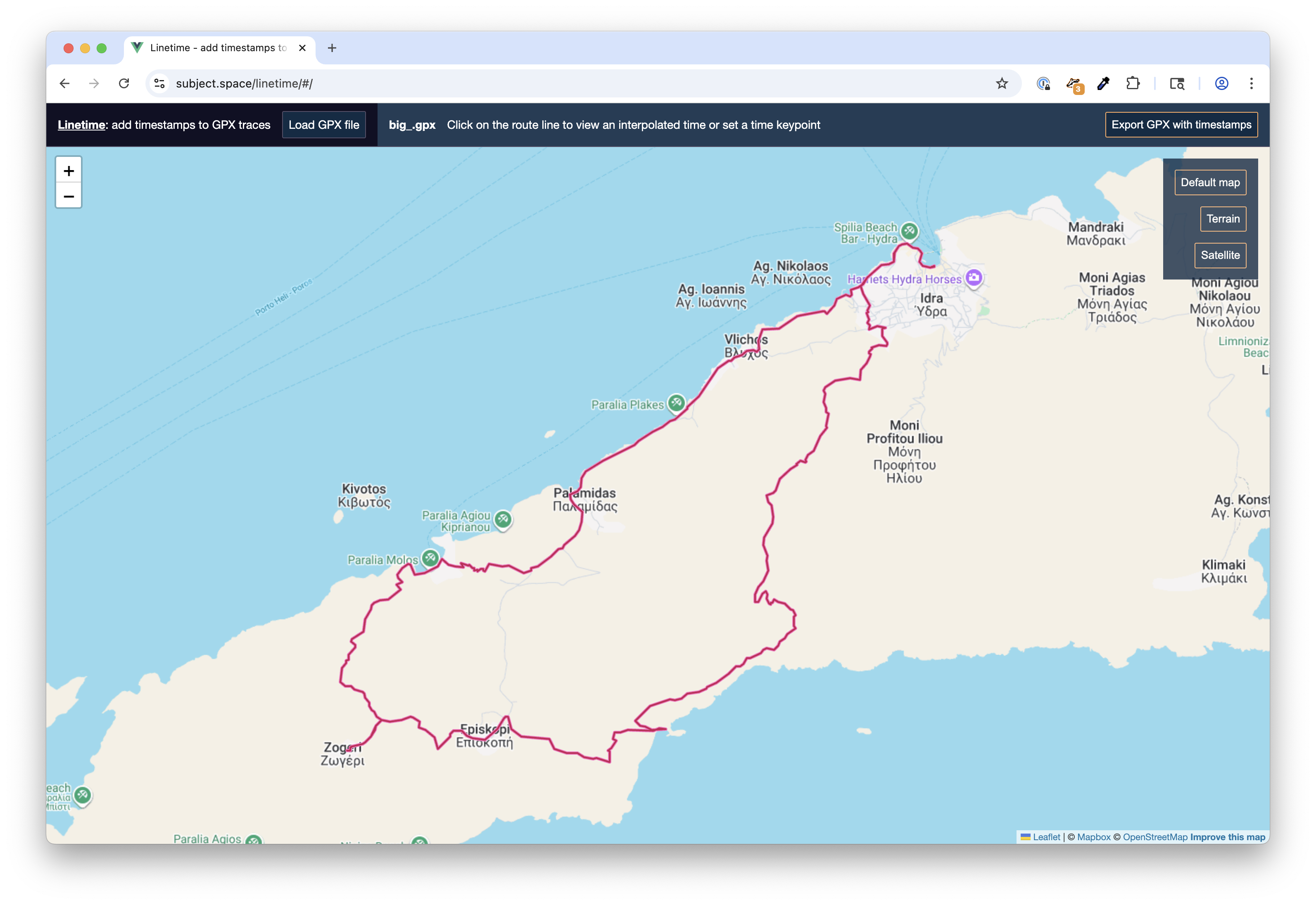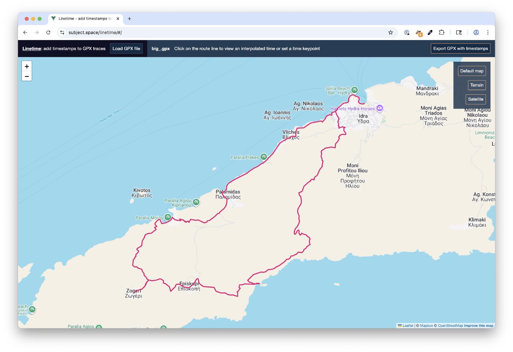 However, I do remember where I was, and have photos that tie those locations to times. I made a tool, Linetime (source), for adding timestamps to a GPX file, which I can use for bulk geotagging photos in Lightroom.