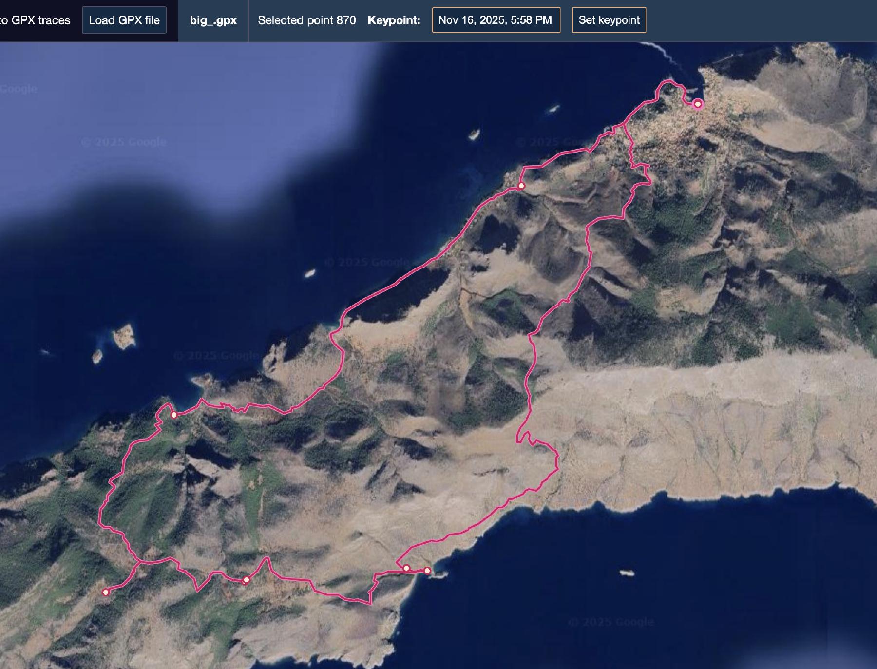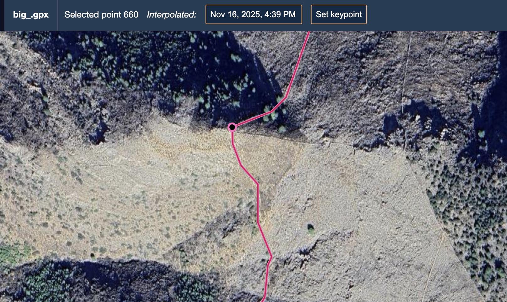 The interpolation is often surprisingly accurate from a small number of points. This picture was taken on top of a ridge at 4:41 PM, and the interpolated time in the route is 4:39 PM.